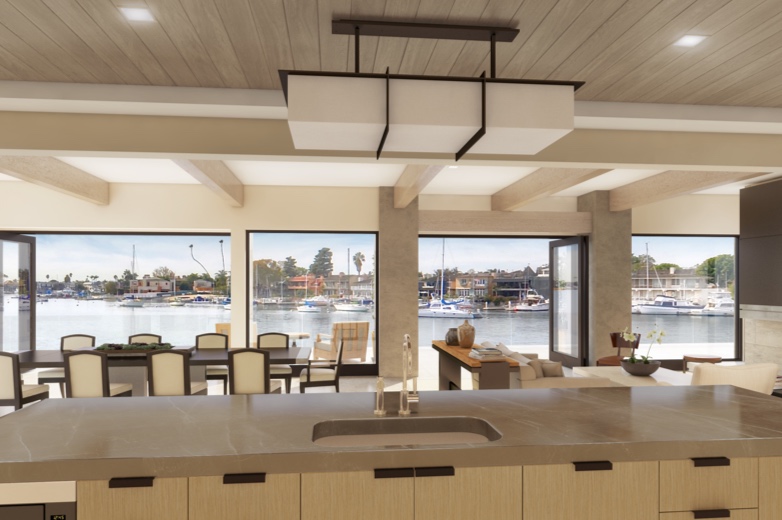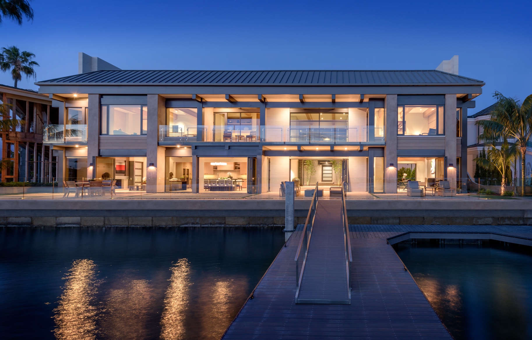 The home is as smart as it is stylish, completely wired and controlled via iPad with smart home technology and 5.1 surround sound systems, Vantage lighting system, and integrated security systems. Attention to detail is apparent at every turn, with highlights including French limestone and custom rift oak flooring, gris pulpis and Travertine marble countertops, walls of Portuguese limestone, black Mexican pebble landscaping accents, all of which blend beautifully and complement the lifestyle. Outdoor living spaces are plentiful and include a private, enclosed courtyard at the front of the residence complete with sparkling spa and swimming pool with a bridge walkway, an oversized terrace spanning the entire width of the property and overlooking the harbor, with access to a private gangway and boat dock, able to accommodate an approximately 60 foot vessel.