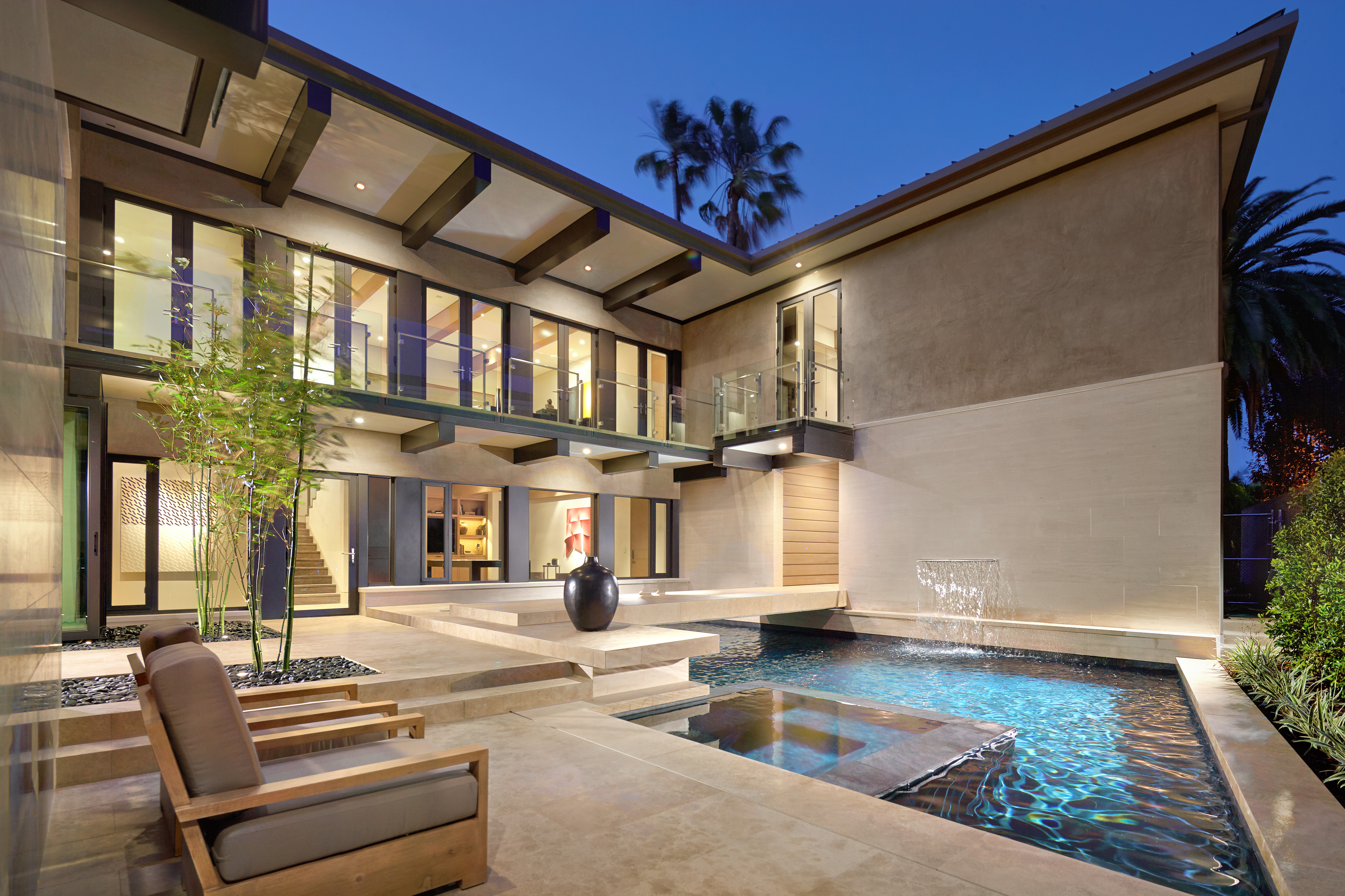 Enter through the front doors into a private, enclosed courtyard, where you're greeted by a beautiful swimming pool and overflowing spa. A bridged walkway leads you across the pool, through glass doors into the main, open living area. Luxurious finishes throughout include complementary French, Portuguese and Spanish Limestone, Italian Vein Cut Travertine, custom rifted oak beams, and a Vantage home automation system.